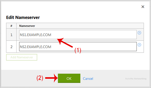 7. Enter your Nameserver in field 1 and field 2 and then click on the "OK" Button.