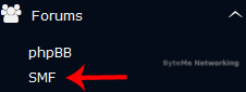 4. On the left side of your screen you should locate the "Forums" category. Click on it and then click on the "SMF" link that will appear.