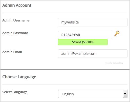 9. Under the "Admin Account" field enter the following information: