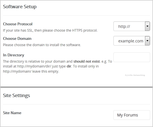 • In Directory: If you want to install this in a directory, for example example.com/forum, enter the directory name. Otherwise, leave this blank to install in your main domain example.com