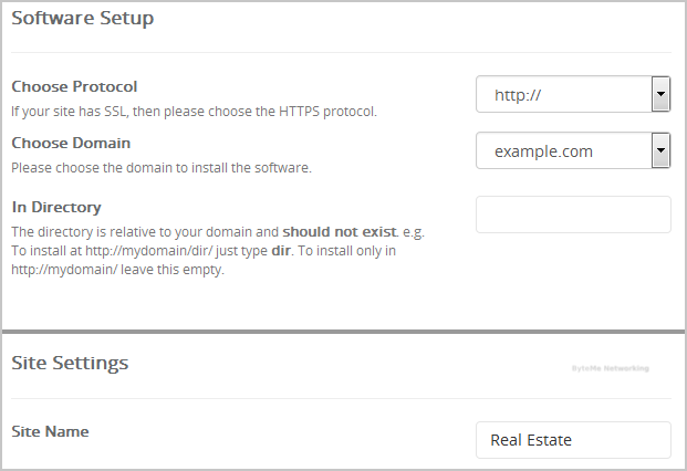 • In Directory: If you want to install this in a directory, for example example.com/directory, enter the directory name. Otherwise, leave this blank to install in your main domain example.com