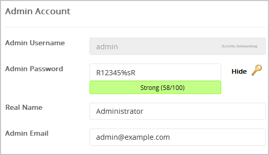 • Admin Username: The default username is "Admin" and the edit option is disabled.