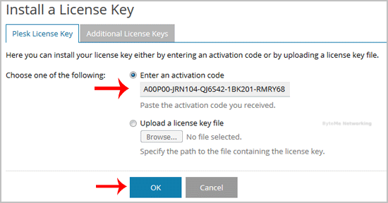 Step 7:  Now click on "Install Key", enter your Plesk Activation code and press ok to save it. You can also use a trial key or use your own key.