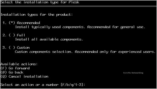 Step 3:  In "Select the Installation type for Plesk" enter "F" or, in case you are familiar with what you are doing, chose the other option - installing all components by entering "2" (without the quotes) and press "F'.